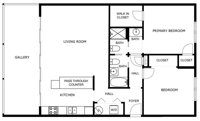 The floor plan prioritizes comfort and pleasure by featuring an open concept living space with expansive glass doors that open directly onto the gallery. The bedrooms are set apart from the main living space, offering a quiet retreat for restful sleep at night.